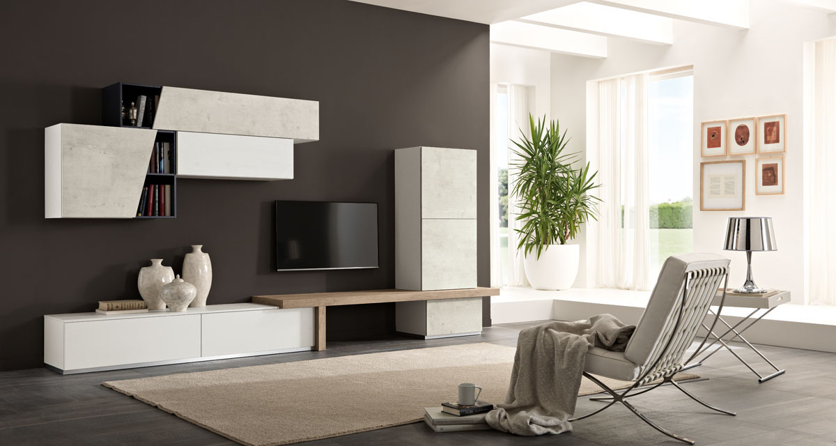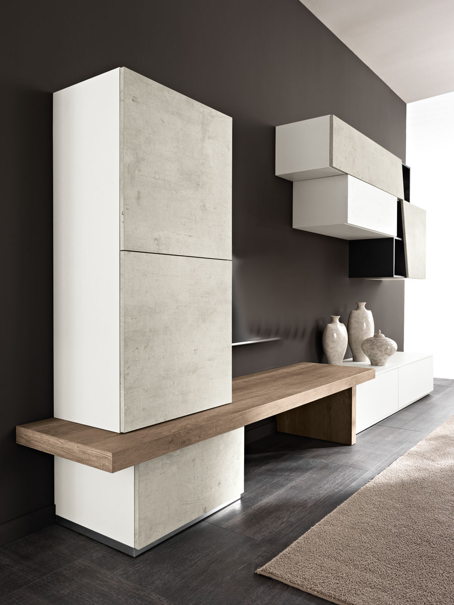 The Exential T06 version is a trendy furnishing boasting asymmetrical lines and a double storage base units with different heights. An innovating living area composition of white cabinets with sharp front doors and maple wood doors: the combination of materials and colours creates an harmonious living room where you can relax after a hard working day. A unique furnishing system where the design concept combines with the country style.