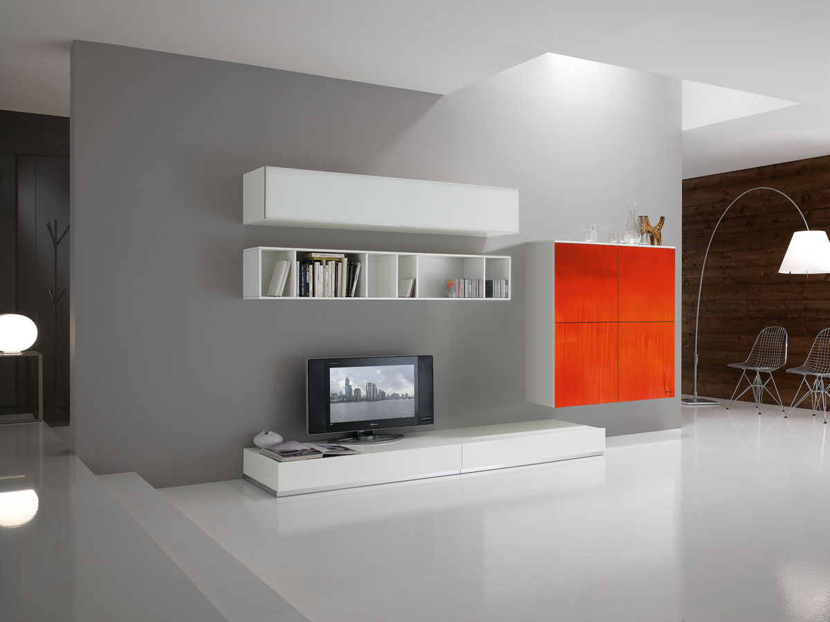 In the Lodola composition, the flawless arrangement of the living room total white cabinets is interrupted by images realized with intense colours on a black base, graphically created by famous artist Lodola. Open cabinets and double base on different levels. This combination of shapes and colours makes the entire composition unique. The white bases perfectly intersect providing a regular shape to the whole structure, like the bookcases and the suspended cabinets.