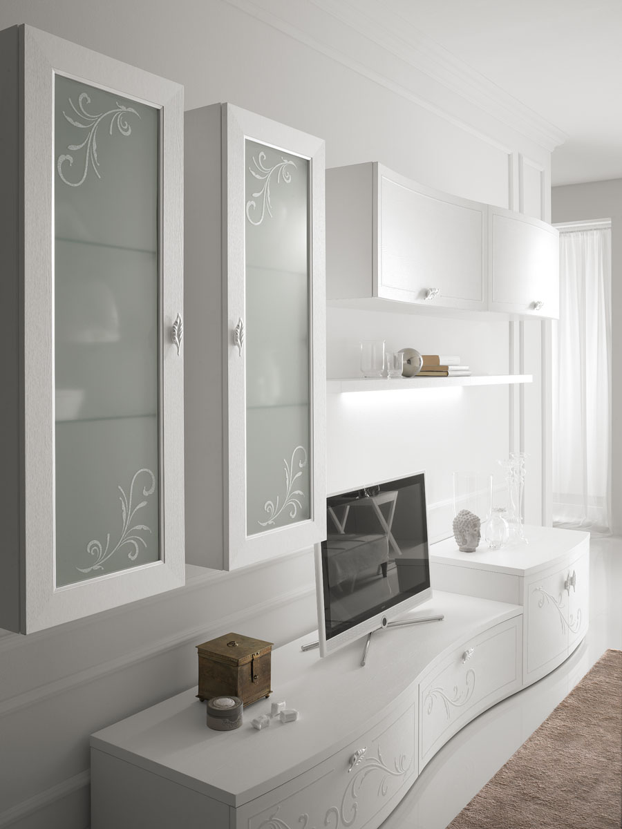 The living room composition Decò 101 is characterized by a white ash wood base with curved fronts, cabinets refined with flowery decorations, silver glitter and big showcases in acid-etched glass. The wall unit presents romantic details for a sober and refined taste. The linear shapes, softened by sinuous elements and big showcases embellished with Swarovski elements and silver decorations. Elegant and impressive accessories that evoke the classic style, for a glamorous and luxury environment.
