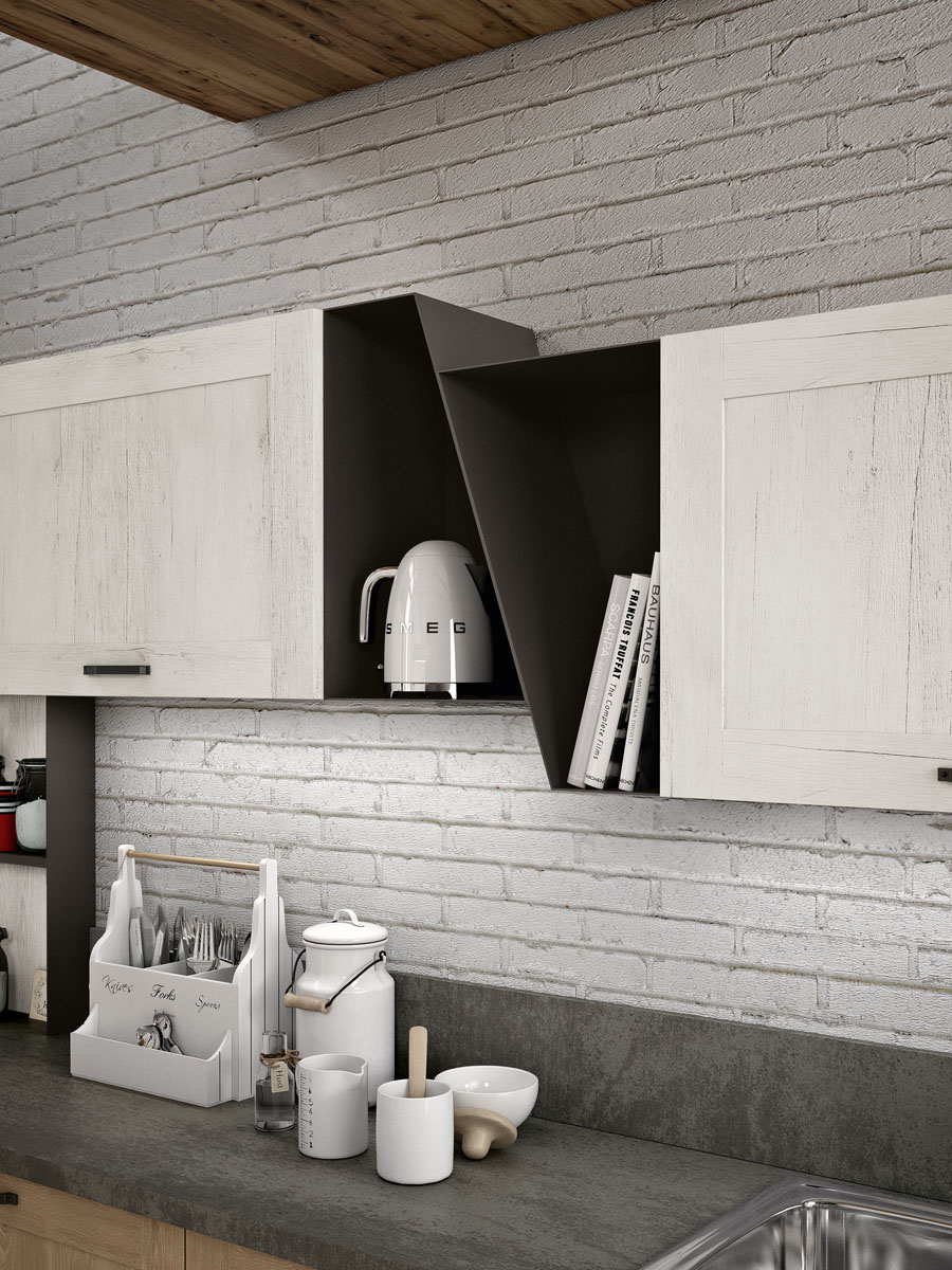 Daytona 07 is the right answer to modernity and it is impossible not to notice it. You will feel at ease thanks to its innovative elements such as the induction hob. The partition wall system separates and connects the various areas, offering you the space to show your objects or store your books and design elements. A kitchen favouring well-being rather than luxury. Behind each door and drawer, there is a set of smart ideas and solutions ready for you.