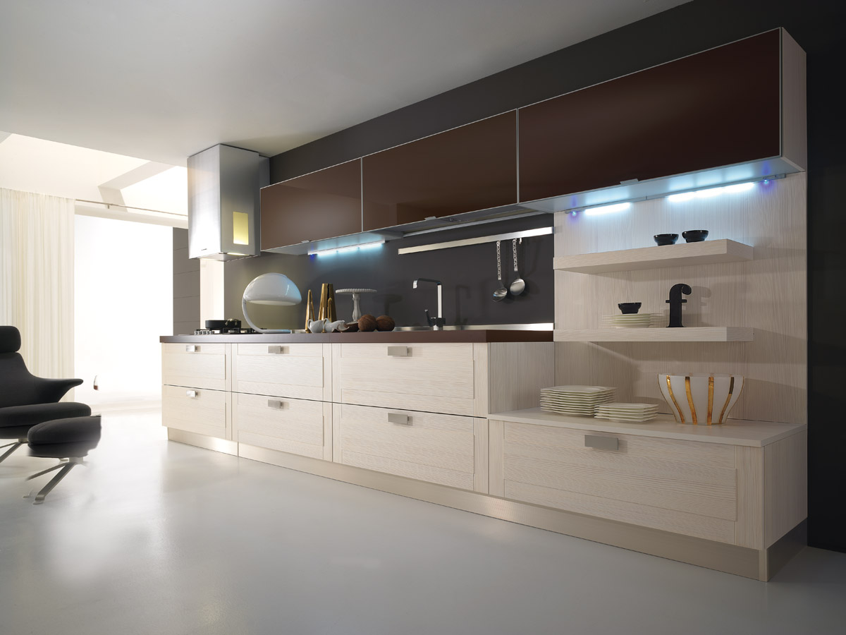 The Diamante 11 version is a two-colour modular modern kitchen combining practicality and design thanks to the under-cabinet led bar. It is characterized by: moka-coloured lacquered glass cabinets; veneered brushed fir doors with relief emboss, white finish; chromed-wire shelves; undercabinet led bar and boiserie.