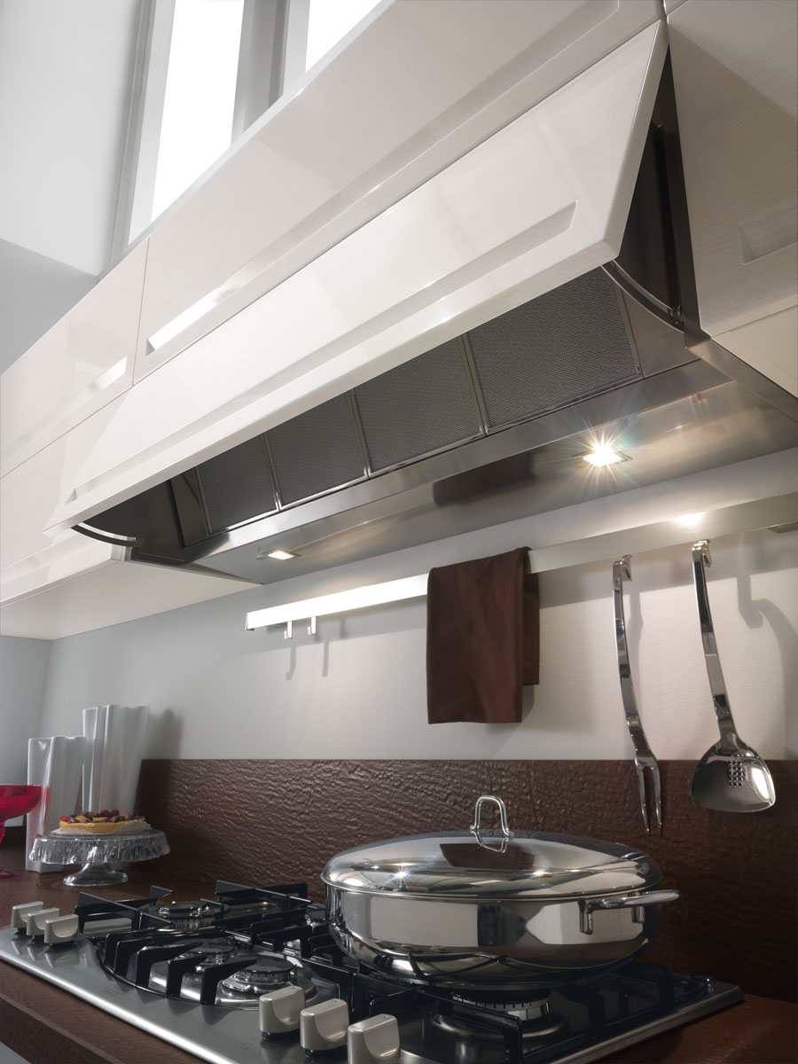 Tropea 34 is a modern modular kitchen. The corner layout, the lacquered white furniture and the chromed-plated details are its main features. Unique in terms of functionality of shapes: the horizontal linearity engenders a sense of continuity. Thanks to the white lacquered colour, the cabinet doors with integrated handles really stand out with glimmering. The steel worktop, together with the many chromed-plated details, perfectly combines with the unusual shaped steel hood.