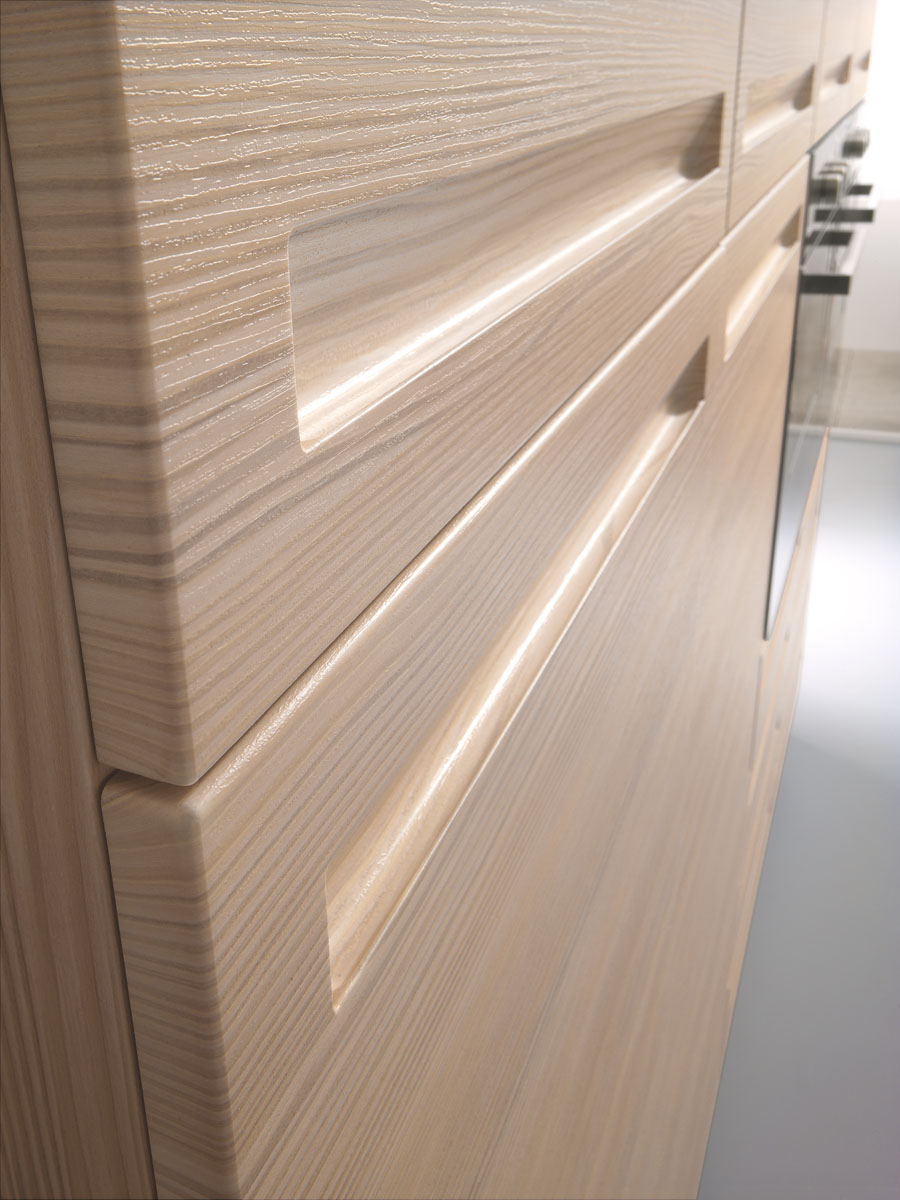 Tropea 14 is a modern modular kitchen with contemporary features given by the handles obtained from the doors, the brightness of the red polymeric drawers and the natural pine finishings. These features perfectly comply with the current customization needs. The hood gives a futuristic touch to the whole structure and the linearity of shapes creates a practical, young and dynamic space.