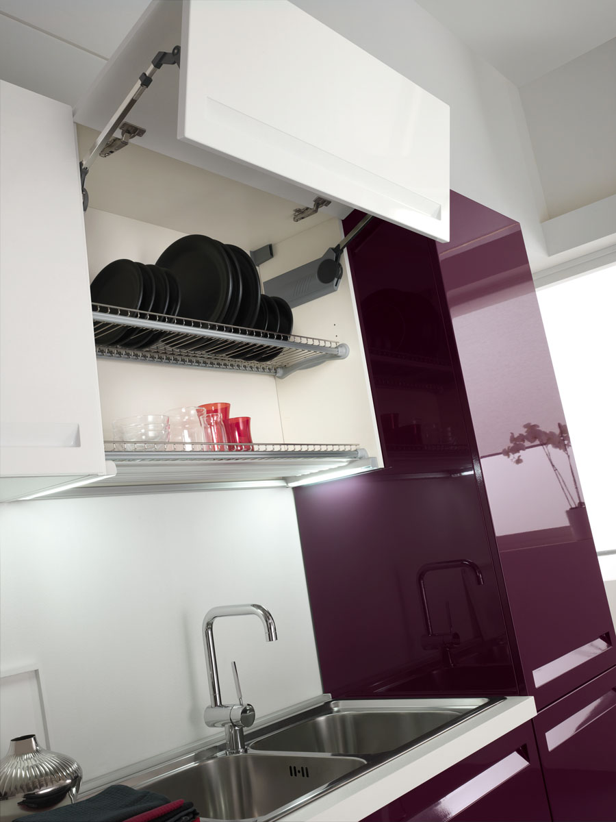 Tropea 52, is a modern modular kitchen characterized by unusual eggplant-coloured finishings. The chromed-plated details, the handles integrated into the doors and the easy opening of cabinets make this kitchen comfortable and functional. The contemporary design geometry of this model blends with the peculiarity of the eggplant colour. The chromed-plated details and the round-shaped hood give personality and brightness to the composition. Practicality and elegance are adjectives that perfectly define the essence of this Tropea version.