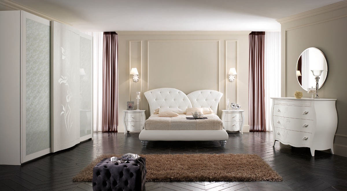 Neoclassical elegance with refined liberty and Swarovski inserts: this is the Prestige C30 style. Soft curves embellished by flowery decorations for a unique refinement. The ash wood wardrobe with sliding doors gives a touch of elegance and romanticism to the whole environment, thanks to the patterned glass and the central decoration. This bedroom perfectly combines the traditional and modern style, for an original and creative environment.