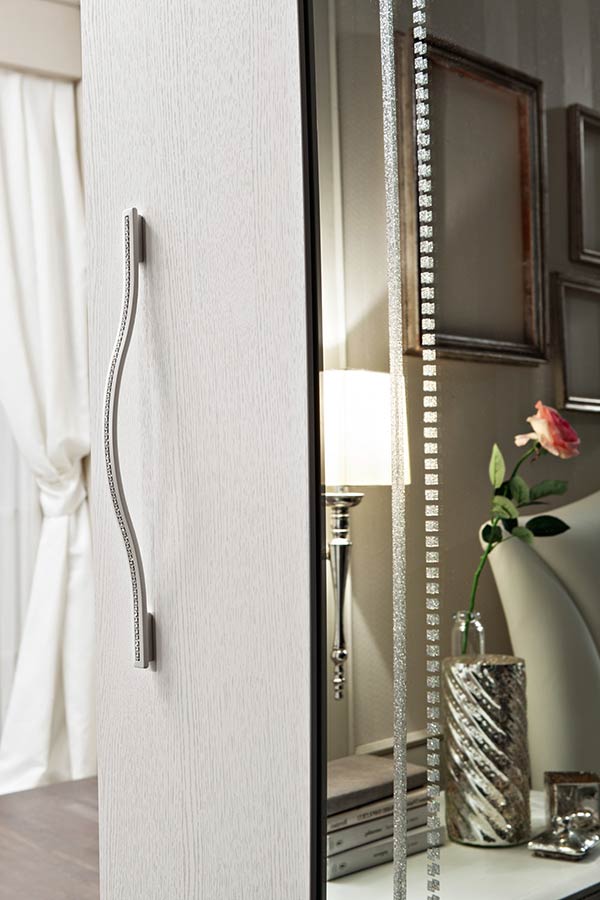 Prestige C41 is a white ash wood furniture, with bronze mirrors. This is an unexpected composition: the white ash wood dresser and the night tables with their squared pattern give the whole space a particular touch of elegance and refinement, while the eco-leather white bed enhances class, also thanks to the Swarovski inserts. Finally, the wardrobe with its big mirror and the flowery insert perfectly combines for a romantic and always original bedroom.